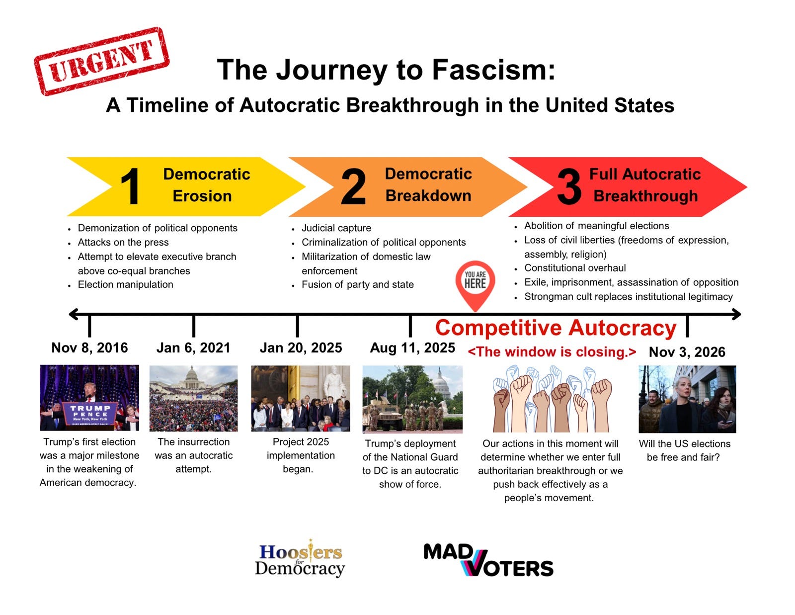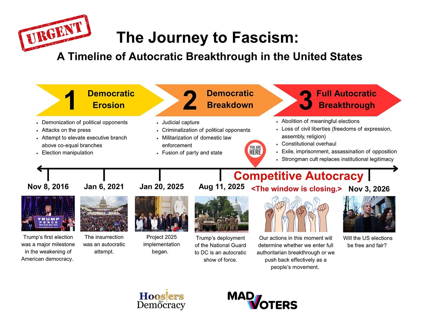 The United States started to see accelerated democratic erosion after Donald Trump was first elected President in 2016. By the time of his 2nd inauguration eight years later, we entered a period of democratic breakdown. What we are currently experiencing is a state known as “competitive autocracy” or “competitive authoritarianism,” described as a “hybrid form of government, in which leaders gain power through democratic institutions and then violate some of the criteria necessary for democratic regimes” by Harvard professor Steve Levitsky.